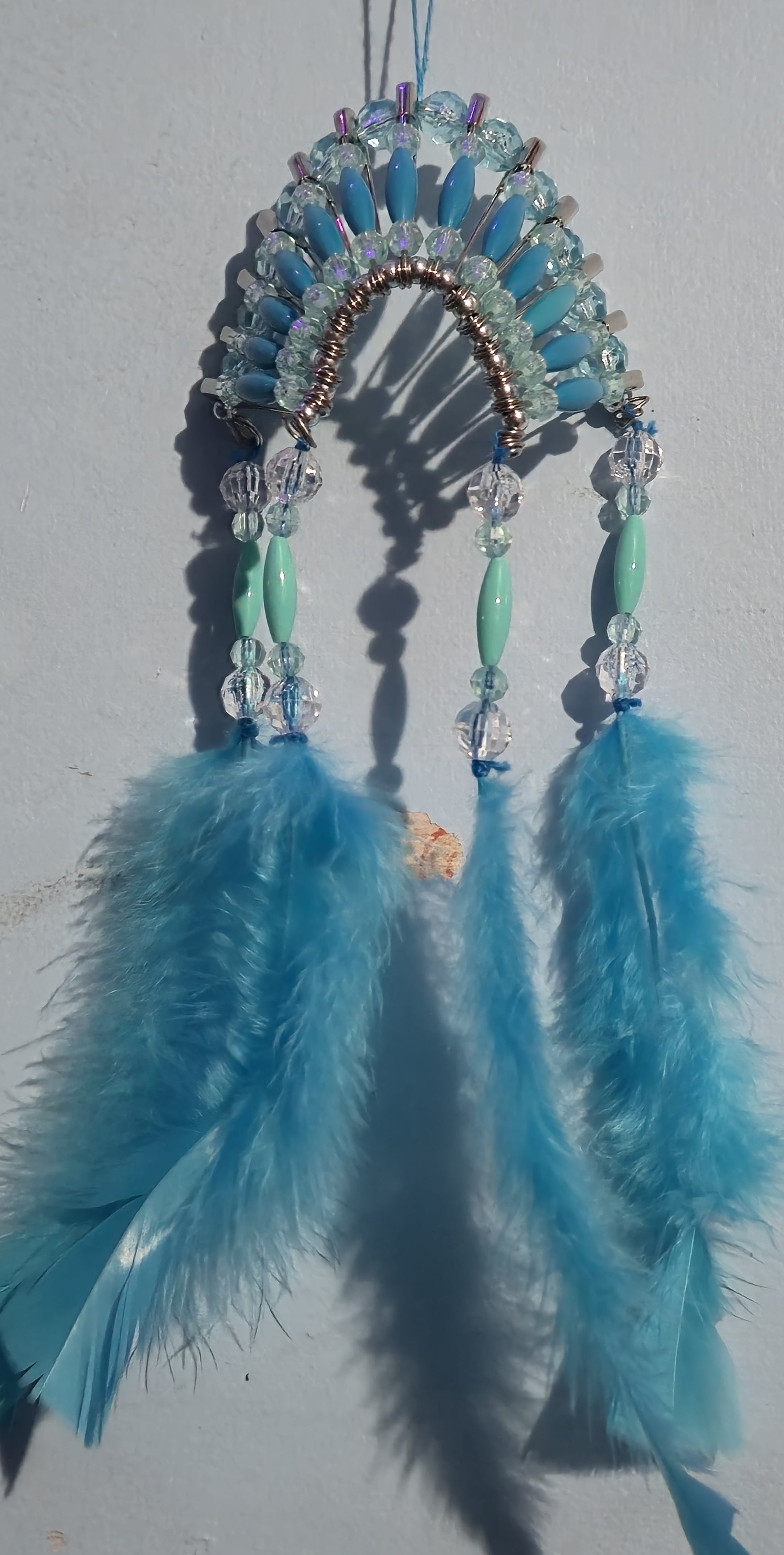 Experience the thrill of boldness with this Native American mini headdress adorned with light blue feathers hang up in any room.